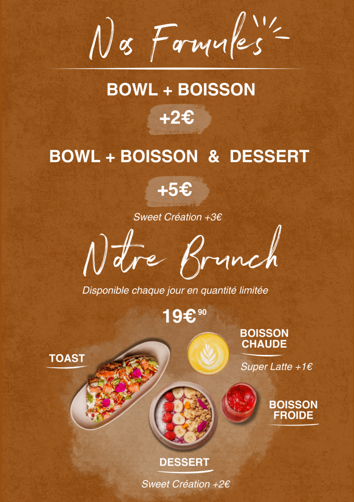 Découvrez notre brunch complet, servi tous les jours avec un toast maison, une boisson chaude, une boisson froide et un dessert gourmand. Idéal pour un brunch healthy , dans un cadre cosy, sur place ou à emporter.